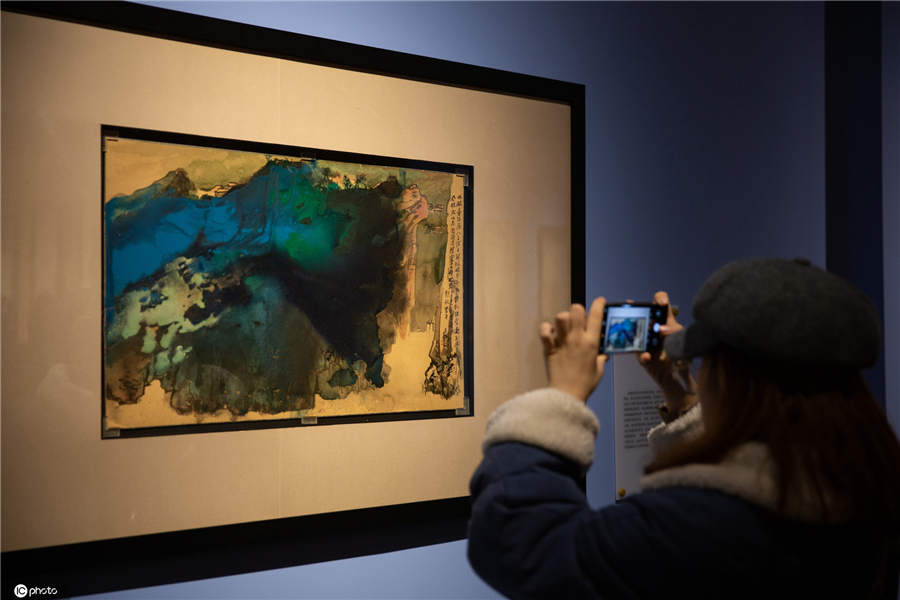 A viewer is attracted by a piece of Zhang Daqian's landscape painting at the opening of the exhibition on Nov 26. [Photo/IC]