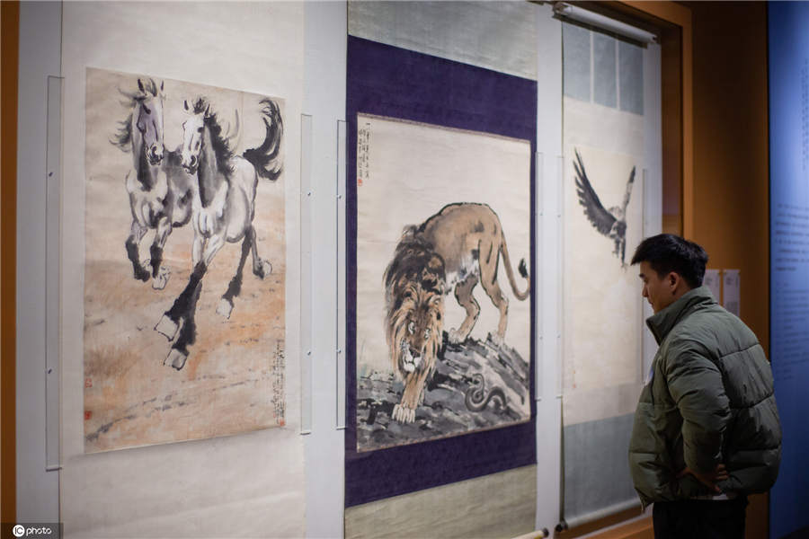 A viewer stops to look at one of Xu Beihong's ink depictions of animals at the opening of the exhibition on Nov 26. [Photo/IC]