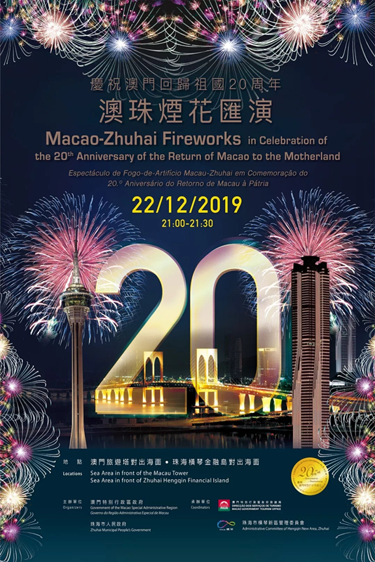 A Macao-Zhuhai fireworks display in celebration of the 20th anniversary of Macao's return to the motherland will be staged at sea areas in front of the Macao Tower and Hengqin Financial Island from 9 to 9:30 pm on Sunday, Dec 22.