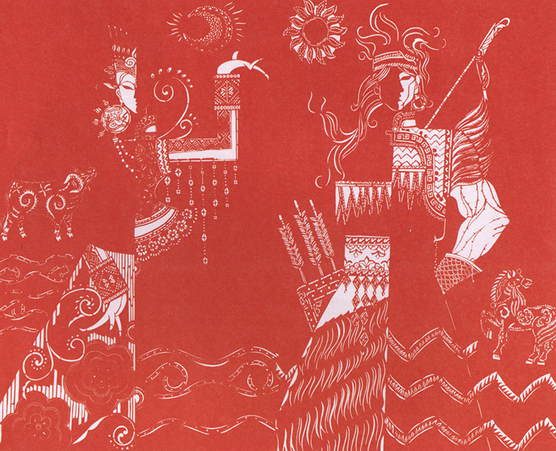This paper-cut work tells the legend of the origin of Khitan, the most credible and accepted ancestors of Daur. Once upon a time, there was a young man riding a white horse down the Laoha River and a young woman walking a black ox along the Xar Moron River. They met at the confluence of the two rivers and fell in love with each other then got married. Each one of their eight sons founded a tribe, thus forming the Khitan ethnic group.