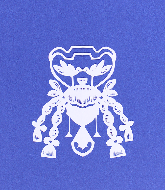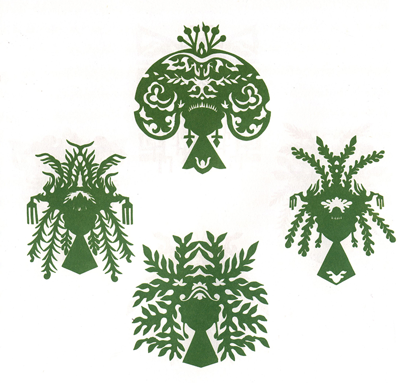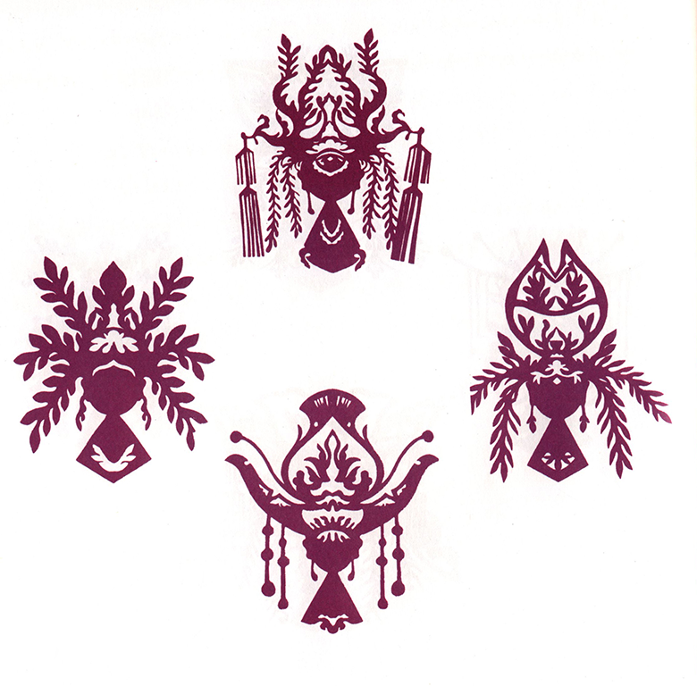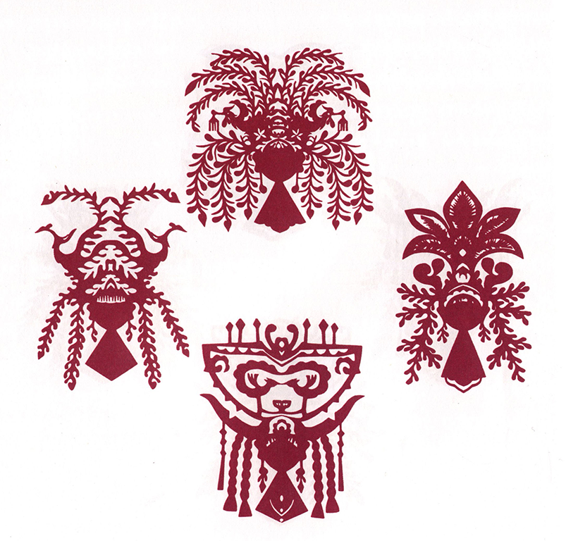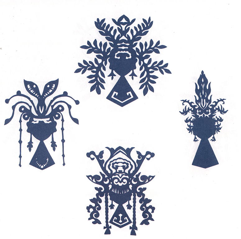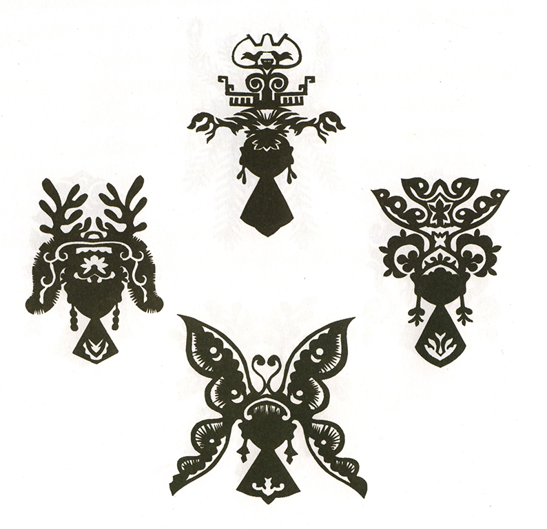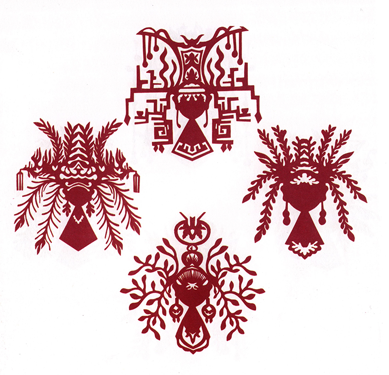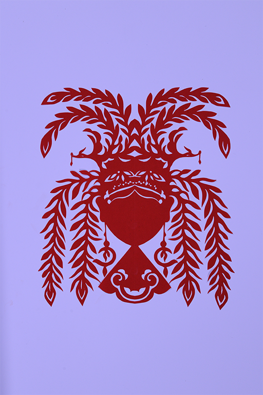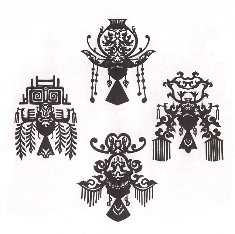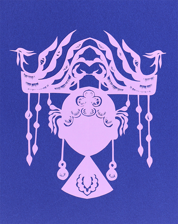 Hanêka headgear paper cutting stands out as a special branch of art for their delicate and exaggerated forms. Mainly designed to be symmetrical, images of birds, flowers, tassels, branches and leaves are commonly included through complex techniques.