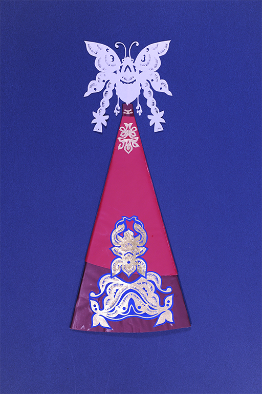In general, a traditional Hanêka has a simple and elegant style. The main body is a cone-shaped figure folded with colored paper, while the head is a silhouette made of unadorned white paper without any facial features. Some decorations are necessary, including collars, accessories and auspicious patterns cut out of colored paper and attached with glue.
