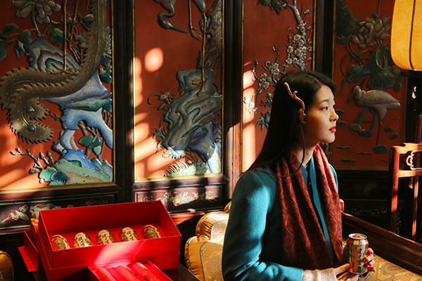 A model poses with a can of Jianlibao featuring auspicious patterns from Qing Dynasty (1644-1911) emperor's robes. [Photo by Jiang Dong/China Daily]