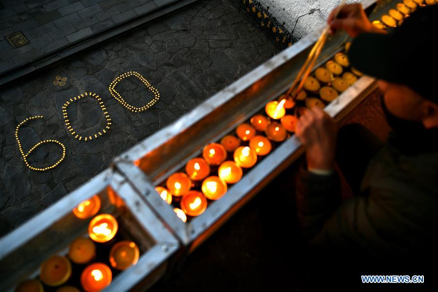 A man lights butter lamps at the Jokhang Temple in Lhasa, capital of Southwest China's Tibet autonomous region, Dec 21, 2019. [Photo/Xinhua]