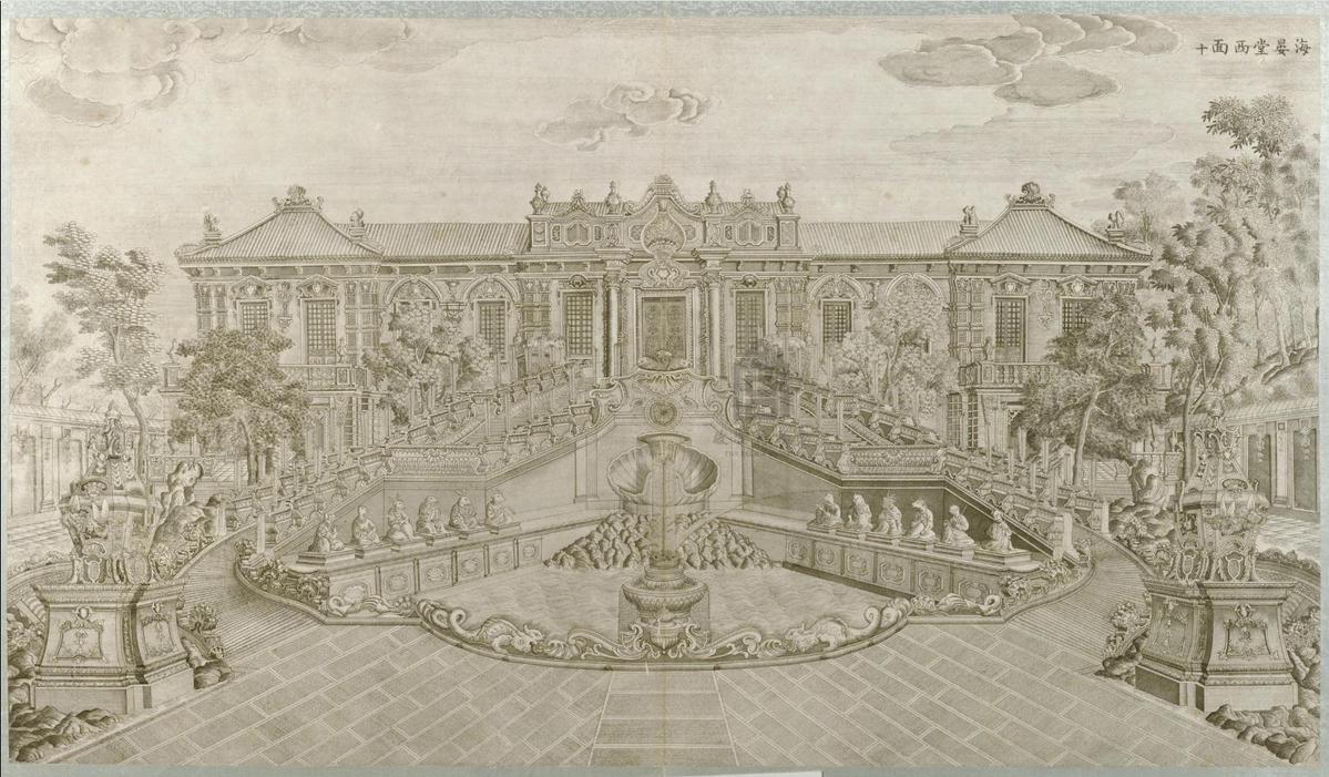 A copperplate engraved print of the water clock fountain and the facade of the Hall of Tranquil Sea, collection of the Palace Museum [Photo/dpm.org.cn]