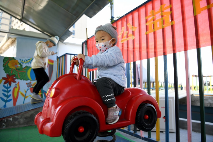 A child plays in the activity area on the roof of a hostel near the Children's Hospital in Hefei, East China's Anhui province, Dec 9, 2019. [Photo/Xinhua]