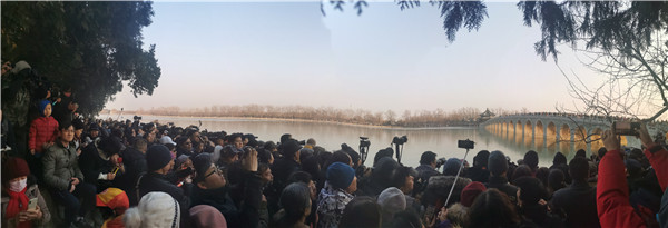 Tourists gather in the Summer Palace to catch sight of the setting sun shining through the Seventeen-Arch Bridge over the Kunming Lake. [Photo/Qiu Dazhao]