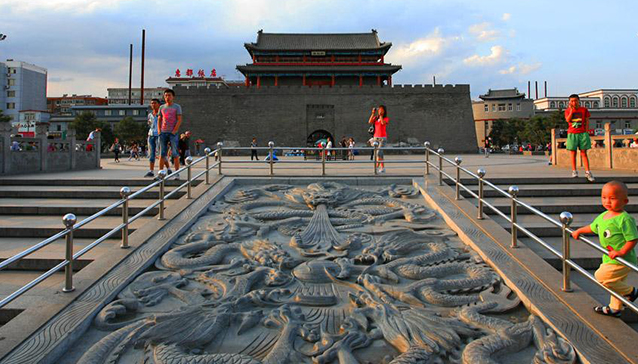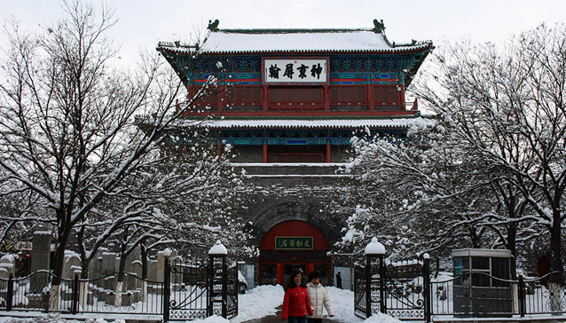 As its name suggests, the Tower of Repressing the North was built to resist the northern Mongolian tribes during the early period of the Ming Dynasty. It is designed in a wooden framework with nine ridges. The plaque hanging on its northern side is the most precious treasure in the city. The inscription reads “Protective Screen of Beijing” (Shenjing Pinghan) and is in the handwriting of Emperor Qianlong (r. 1736-95). Installed with a giant drum for announcing the time and other important moments, the tower is also called “the drum tower”.