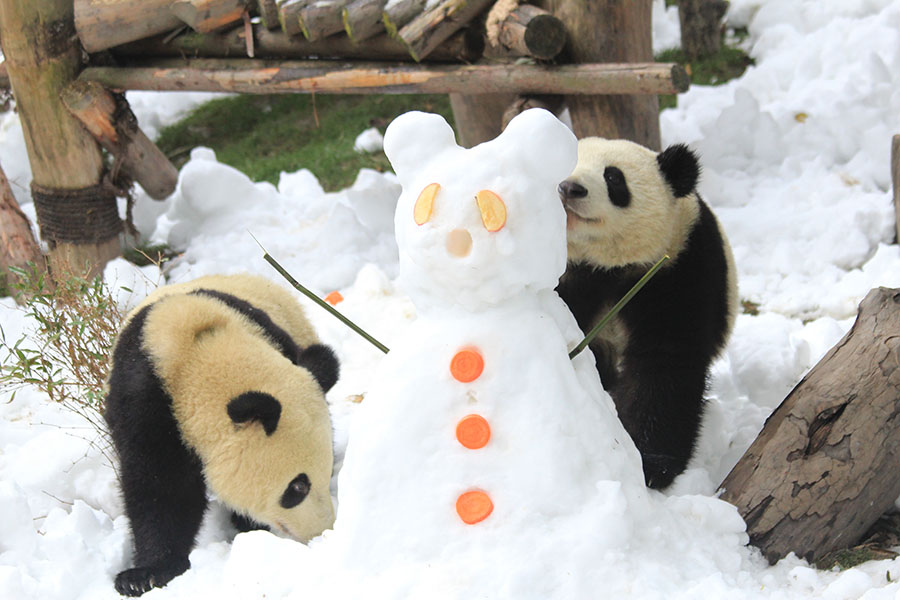 Two giant pandas play around a snowman in Chengdu Research Base of Giant Panda Breeding in southwest China's Sichuan province on Dec 25, 2019. [Photo provided to chinadaily.com.cn]