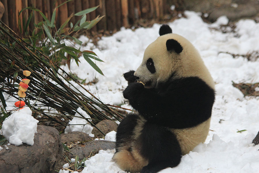 Giant pandas enjoy snow in Chengdu