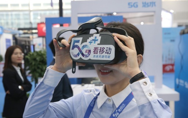 A visitor tries a 5G-enabled device of China Mobile during an industry expo in Nantong, Jiangsu province. [Photo by Xu Congjun/for China Daily]