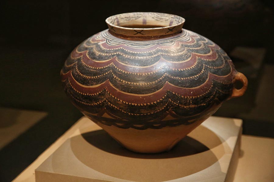 Neolithic and bronze-age pottery painted with a variety of primitive and creative patterns are on show at