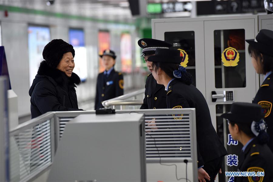 A passenger checks in to take the test-run Rail Transit Line 3 in Hefei City, east China's Anhui Province, Dec. 18, 2019. The Rail Transit Line 3 started test runs Wednesday and was open to the public for free during the test period lasting to Dec. 22. It was scheduled to be put into official operation by the end of this month. (Xinhua/Zhou Mu)