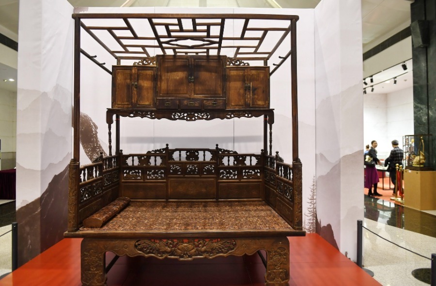 Photo taken on Dec 29, 2019 shows a bed made of Hainan rosewood in an exhibition in Fuzhou, Southeast China's Fujian province. The exhibition opened at the Fujian Provincial Museum Sunday, with 150 Hainan rosewood collections on display. [Photo/Xinhua]