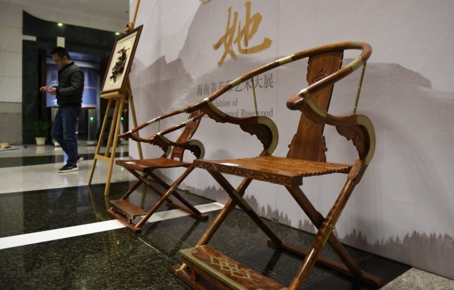 Photo taken on Dec 29, 2019 shows a chair made of Hainan rosewood in an exhibition in Fuzhou, Southeast China's Fujian province. The exhibition opened at the Fujian Provincial Museum Sunday, with 150 Hainan rosewood collections on display.[Photo/Xinhua]