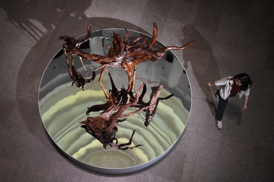 A tourist visits the artworks of root carving made of Hainan rosewood, or Hainan dalbergia odorifera, in an exhibition in Fuzhou, capital of East China's Fujian province on Dec 29, 2019. The exhibition opened at the Fujian Provincial Museum Sunday, with 150 Hainan rosewood collections on display.[Photo/Xinhua]