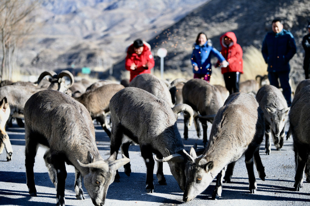 Residents in Yinchuan, capital city of Ningxia, got the opportunity on last Sunday to have close interaction with some bharals who came to the city's Helanshan National Forest Park for food.