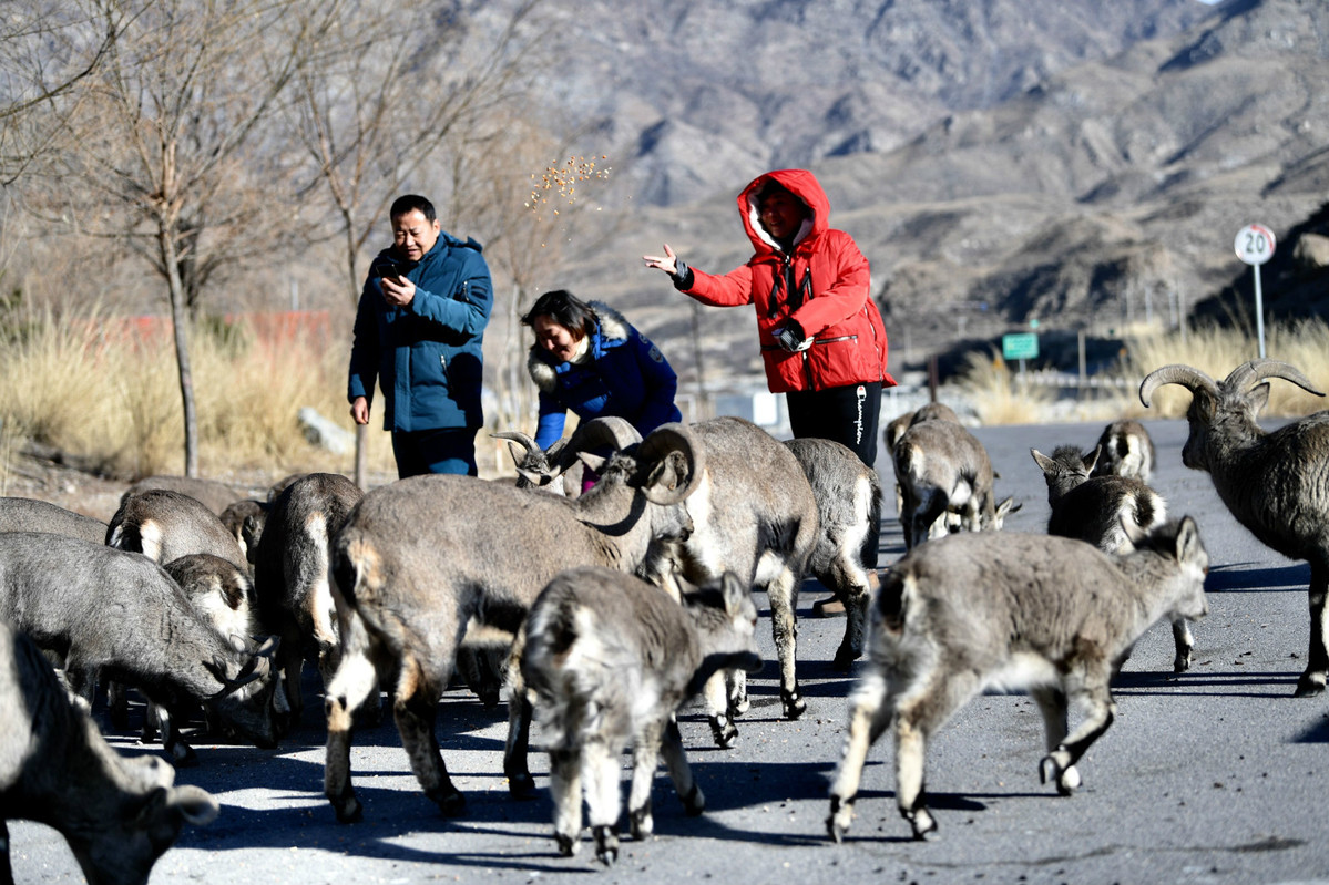 Residents in Yinchuan, capital city of Northwest China's Ningxia Hui autonomous region, see bharals up close after the animals came to the city's Helanshan National Forest Park looking for food. [Photo by Hai Kun/for chinadaily.com.cn]