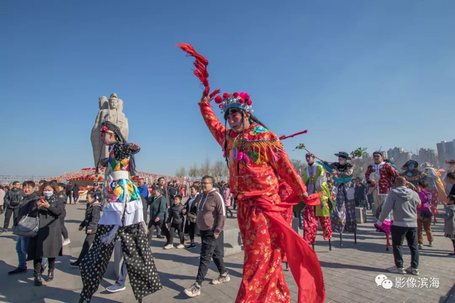 Street performers walking on stilts allow visitors to appreciate them close-up. The performers are mostly young people, which shows that this skill is being passed down through the generations. [Photo/Binhai Photo]
