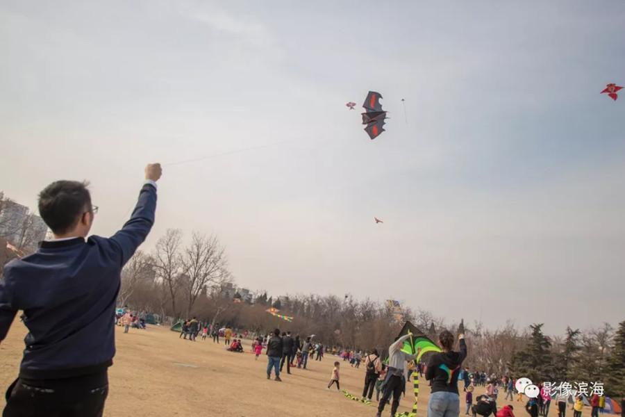 With a pleasant spring breeze and nice temperature, many parents take their children to fly kites and play in the park. [Photo/Binhai Photo]
