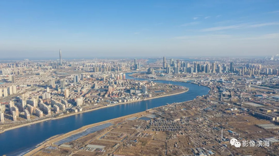 On a sunny February 7, the Haihe River meanders eastward, passing through Tanggu District, and out into the Bohai Sea. [Photo/Binhai Photo]