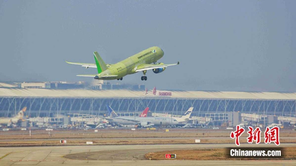 The sixth and final C919 test aircraft made by COMAC takes off at 10:15 am on Dec 27 from Shanghai Pudong International Airport. [Photo/Chinanews.com]