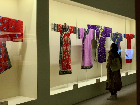 Visitor appreciates clothes from the 1987 TV series Dream of the Red Chamber. [Photo/Li Haoran]