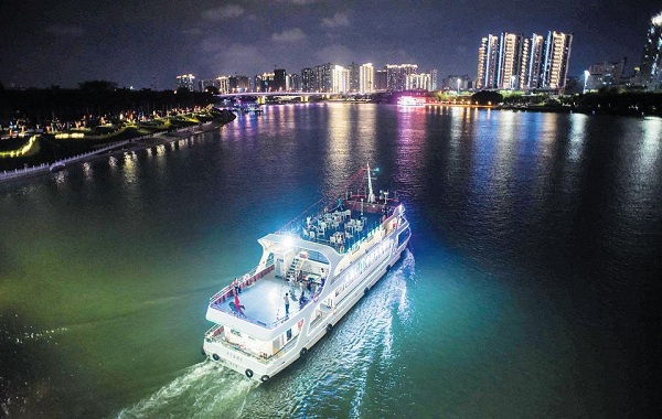 Tourists take a night cruise on the Yongjiang River in Nanning. [Photo by Wei Qiao/Nanning Daily]