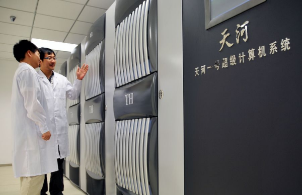 File photo shows rsearchers are examing the operational conditions of Tianhe-1. [Photo/Xinhua]