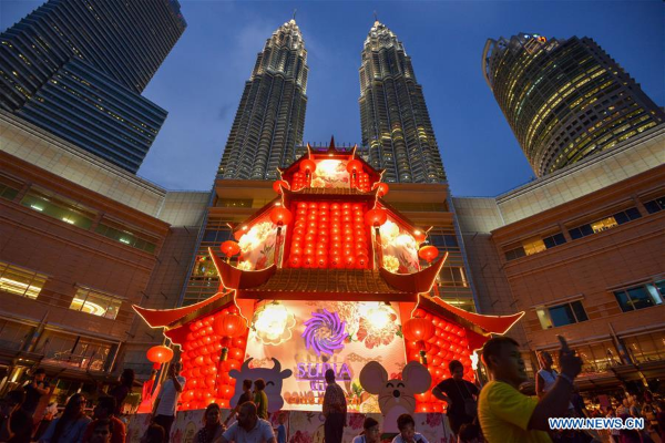 Photo taken on Jan 21, 2020 shows decorations for the upcoming Chinese Lunar New Year in front of the Petronas Twin Towers in Kuala Lumpur, Malaysia. [Photo/Xinhua]
