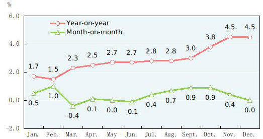 The CPI in urban and rural areas posted a year-on-year growth of 4.2 percent and 5.3 percent, respectively. The core CPI, which excludes food and energy prices, ticked up 1.4 percent year-on-year in December, flat with that in November.