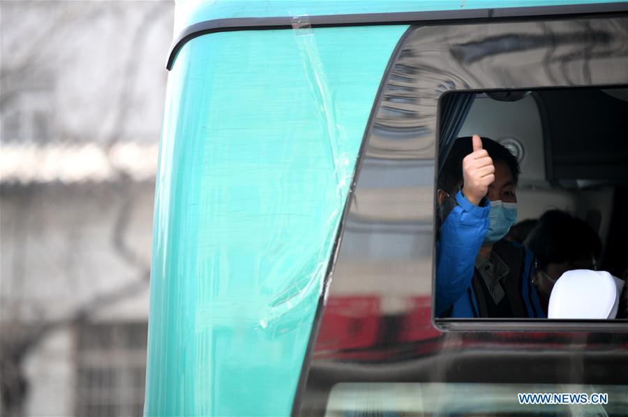 Lyu Zhian, a member of a medical team of the Second Affiliated Hospital of Xi'an Jiaotong University, says goodbye to his colleagues before leaving for Hubei province in Xi'an, capital of Northwest China's Shaanxi province, Feb 8, 2020. A medical team comprised of 130 members from the Second Affiliated Hospital of Xi'an Jiaotong University left Xi'an for Hubei province on Saturday to aid the novel coronavirus control efforts there. [Xinhua/Li Yibo]