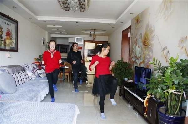 Residents do exercise at home following online instructions in Xining, capital of Northwest China's Qinghai province. [Photo/China News Service]