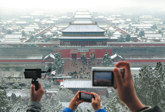 Visitors take photos of beautiful snowscapes at the Forbidden City in Beijing. [Photo/Xinhua]