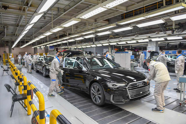 Employees work on a production line at FAW-VW, a joint venture in Changchun, Northeast China's Jilin province, which recently restarted manufacturing. [Photo provided to chinadaily.com.cn]