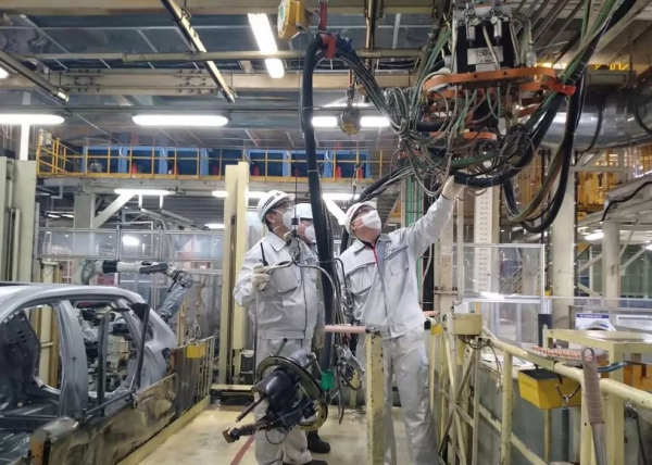 Employees check out equipment on a production line at SFTM, a joint venture between FAW and Toyota, which resumed manufacturing late in the second week of February. [Photo provided to chinadaily.com.cn]