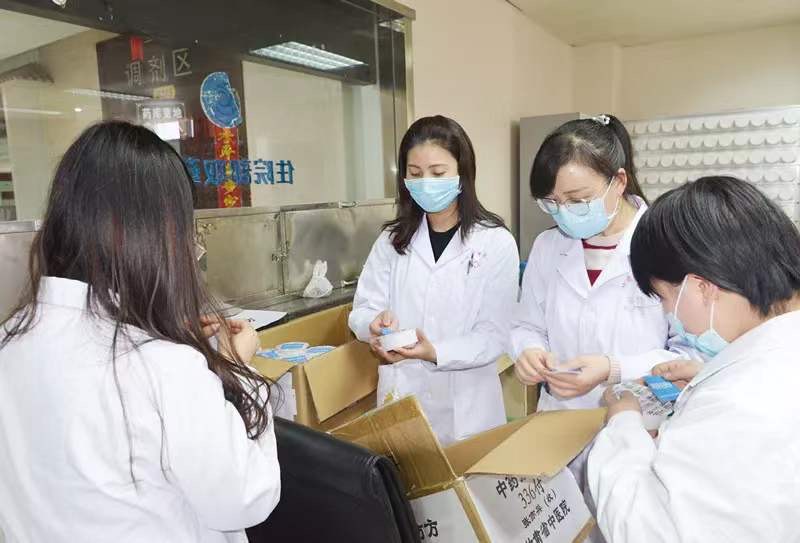 TCM pharmacists attach labels to medicines. [Photo provided to chinadaily.com.cn]