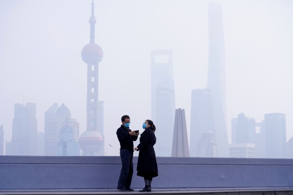 People wearing masks are seen on a bridge in front of the financial district of Pudong, in Shanghai, Feb 3, 2020. [Photo/Agencies]