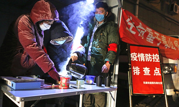 Tireless volunteers at Yuandonglu community prepare to eat instant noddles during their night work shift, on Feb 21. [Photo by Bai Shi for chinadaily.com.cn]