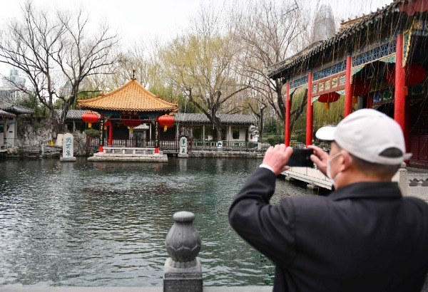 A visitor takes photos at Baotu spring, Jinan city, Shandong province, Feb 27, 2020. Some tourist attractions in low-risk regions of the novel coronavirus outbreak have gradually reopened to the public.[Photo/Xinhua]