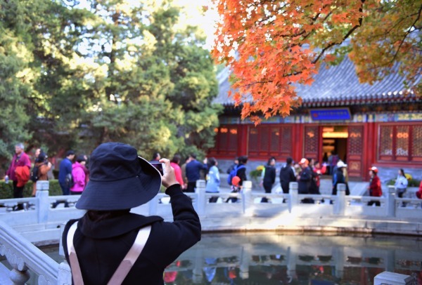 Fragrant Hills in suburban Beijing witnessed traffic jams last weekend after a large number of tourists swarmed into the forest park. Its management bureau later shut down indoor areas and closed five parking lots from Monday in an effort to limit the number of tourists.