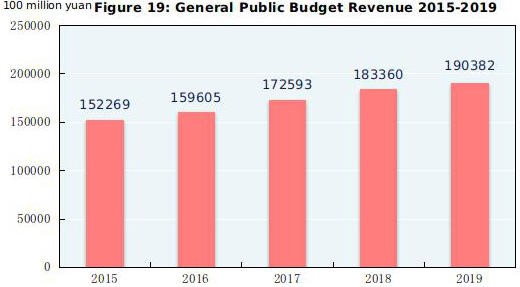 The national general public budget revenue reached 19.04 trillion yuan($2.76 trillion) in 2019, up by 3.8 percent over that of the previous year, of which tax revenue amounted to 15.80 trillion yuan, an increase of 158.9 billion yuan, up by 1.0 percent. The national general public budget expenditure reached 23.89 trillion yuan, up by 8.1 percent over that of the previous year.