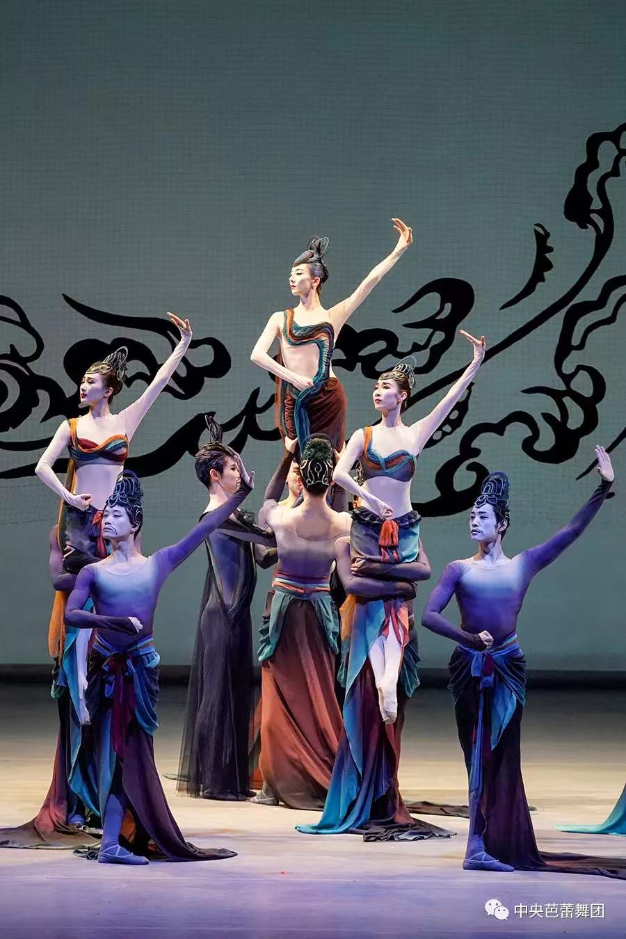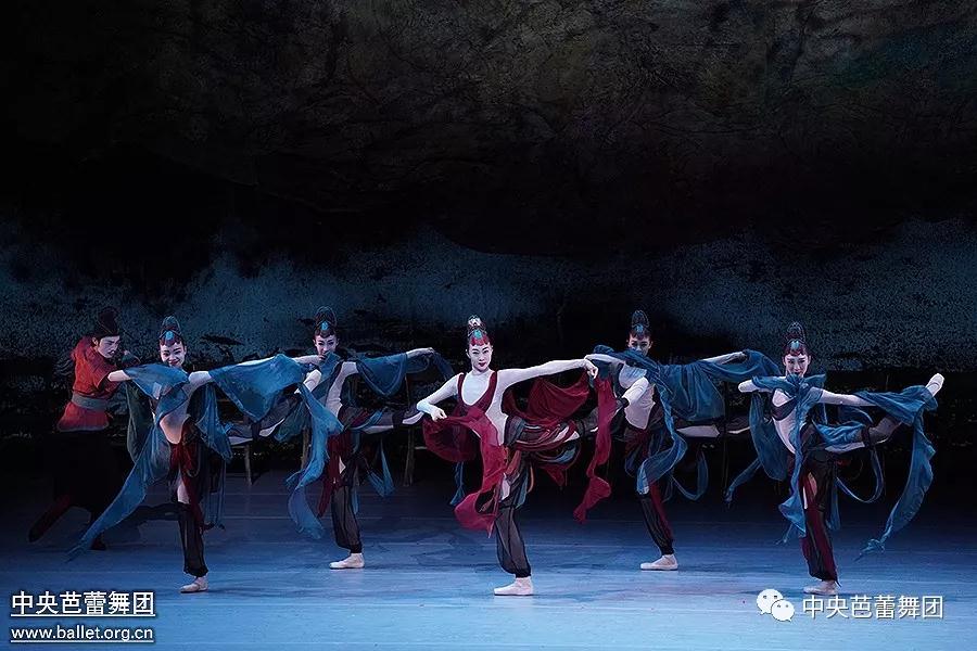 The ballet is an homage paid to the obscure heroes protecting and studying the Mogao Cave art at Dunhuang -- an oasis and religious and cultural crossroad of the Silk Road. Stunning scenes depicted on the cave murals are presented on stage: the flying Apsaras, the procession of devout Buddhist donors, and the legendary huxuan dance (an exotic dance introduced from Central Asia in the 8th century with the dancers rapidly twirling their bodies on one leg). Dressed in long-tailed, narrow gauze skirts dyed green, indigo, and vermillion, the dancers extend and move their arms softly. They take small steps in on-point shoes so that the body can present a natural curve at the waist to imitate the flying Apsaras on the mural.