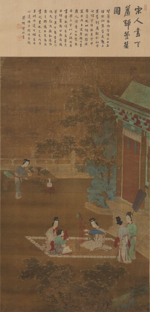 The painting is executed with fine lines and rich colors. It depicts noble women playing musical instruments on a carpet in front of a palatial building, and reveals their joyful state of mind over noble recreational activities.