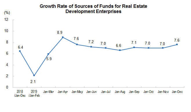 In 2019, the sources of funds for real estate development enterprises reached 17.86 trillion yuan, an increase of 7.6 percent over the previous year, the growth rate was 0.6 percentage points faster than that from January to November, and 1.2 percentage points faster than that of the previous year. Among them, domestic loans reached 2.52 trillion yuan, an increase of 5.1 percent; foreign investment reached 17.6 billion yuan, an increase of 62.7 percent; self-raised funds reached 5.82 trillion yuan, an increase of 4.2 percent; deposits and advances reached 6.14 trillion yuan, an increase of 10.7 percent; personal mortgage loans reached 2.73 trillion yuan, an increase of 15.1 percent.