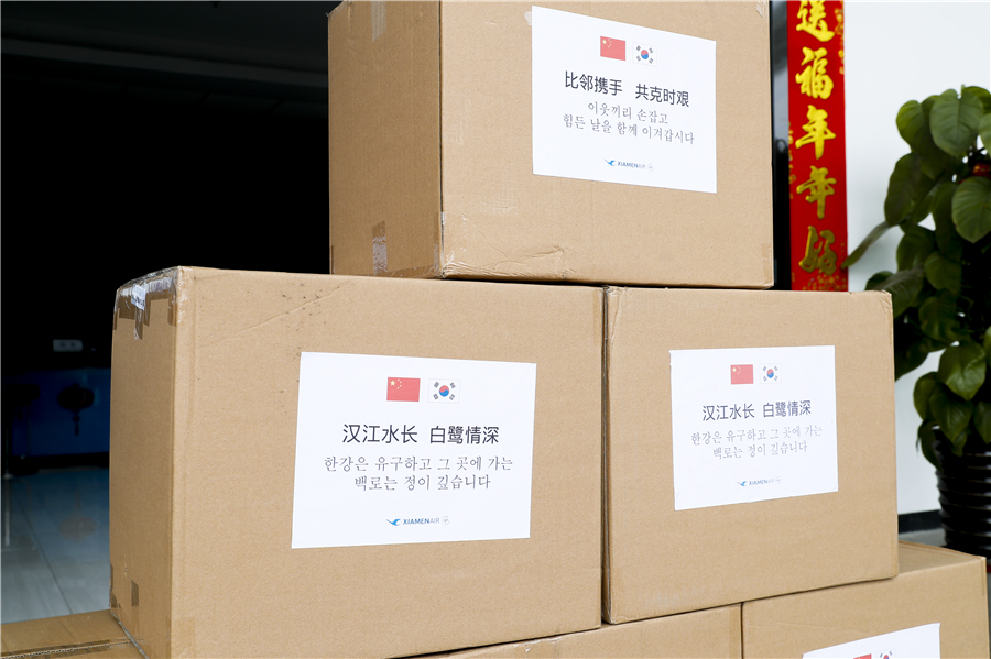 The face masks donated by Xiamen Airlines to its South Korean captains, as well as pilots registered at Korean Air Pilots Association. [Photo by He Sheng/for chinadaily.com.cn]