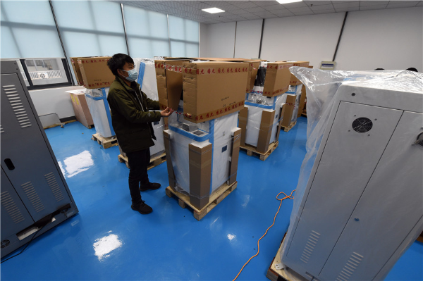 A staff member packages a no-contact self-service machine in Hefei, East China's Anhui province, on March 9, 2020. [Photo/Xinhua]