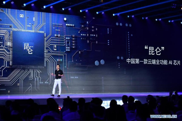 Baidu's Chairman and CEO Robin Li introduces an AI chip during Baidu Create 2018 at the China National Convention Center in Beijing on July 4, 2018. [Photo/Xinhua]