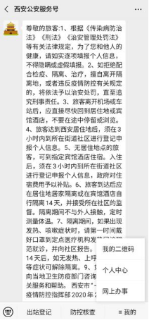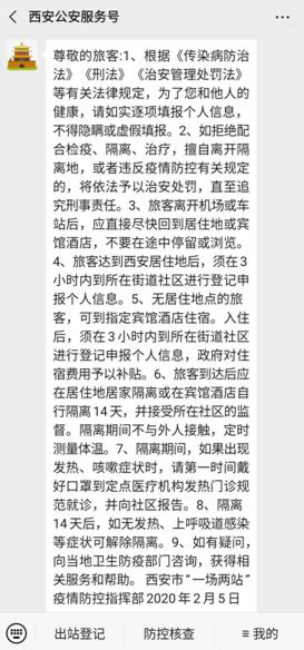 Before leaving the airport, railway station, high-speed railway station, long-distance bus station or entering Xi'an through the inspection station, please prepare your ID card in advance and access your personal QR code on your mobile phone for the public security police to scan and review. (for the outbound passengers of cross district and long-distance passenger transport in the city, they need to show their tickets and ID cards to the police, and they can only leave the station after the verification)