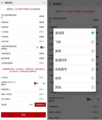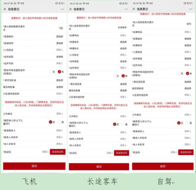 Different items are to be filled out depending on the type of transportation. After entering the verification code you receive on your phone, click "保存"